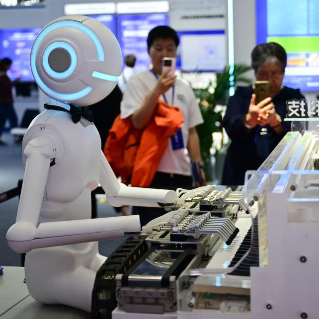 4月26日,观众在第三届中国(安徽)科技创新成果转化交易会上观赏一款弹钢琴的机器人。新华社记者 周牧 摄