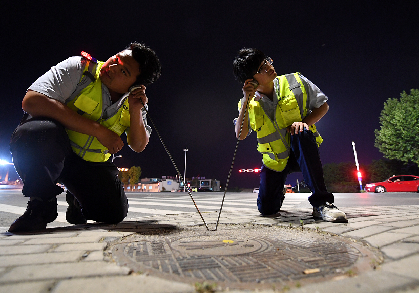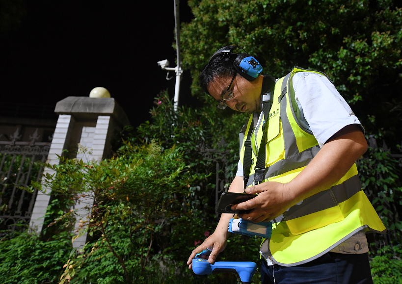 听漏,就是通过特有的专业设备,把细小的水流声放大,然后根据声音的变化,判断并找到深埋于地下的水管漏点。除了白天,听漏大部分时间在夜晚。没有白天的喧嚣,地下管网细微的水流声才格外清晰。