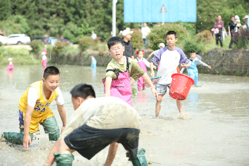 三山村万亩梯田依山势层叠而上,春天水光潋滟如镜,夏日稻浪翻滚似锦,是皖南丘陵地区农耕文明的鲜活印记。本次活动紧扣“田园、生态、乡情”主题,创新设计四大体验场景。游客们既能浑水摸鱼寻野趣,卷起裤腿踏入生态水田,亲子协作捕捉稻田鱼虾,感受传统农耕智慧;又能在梯田插秧赛技艺,化身“现代农夫”,参与插秧竞技,优胜者可获梯田稻米丰收季专属礼遇;还能清溪垂钓品山韵,在山涧溪畔执竿静候,收获的鲜鱼可现场烹制为特色农家菜。