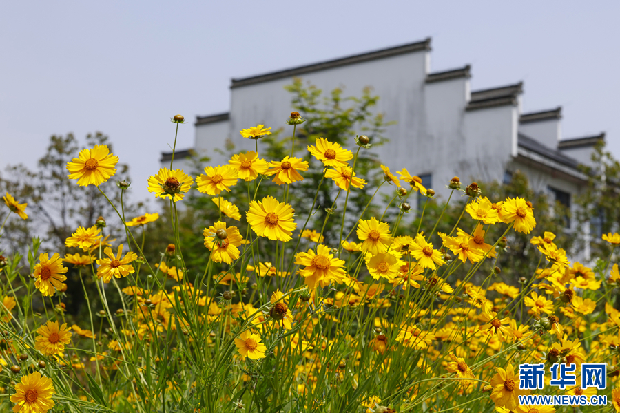 初夏时节,安徽省黄山市徽州区西溪南镇乡村道路旁的金鸡菊花渐次绽放,娇艳欲滴,扮靓徽州田园风景。