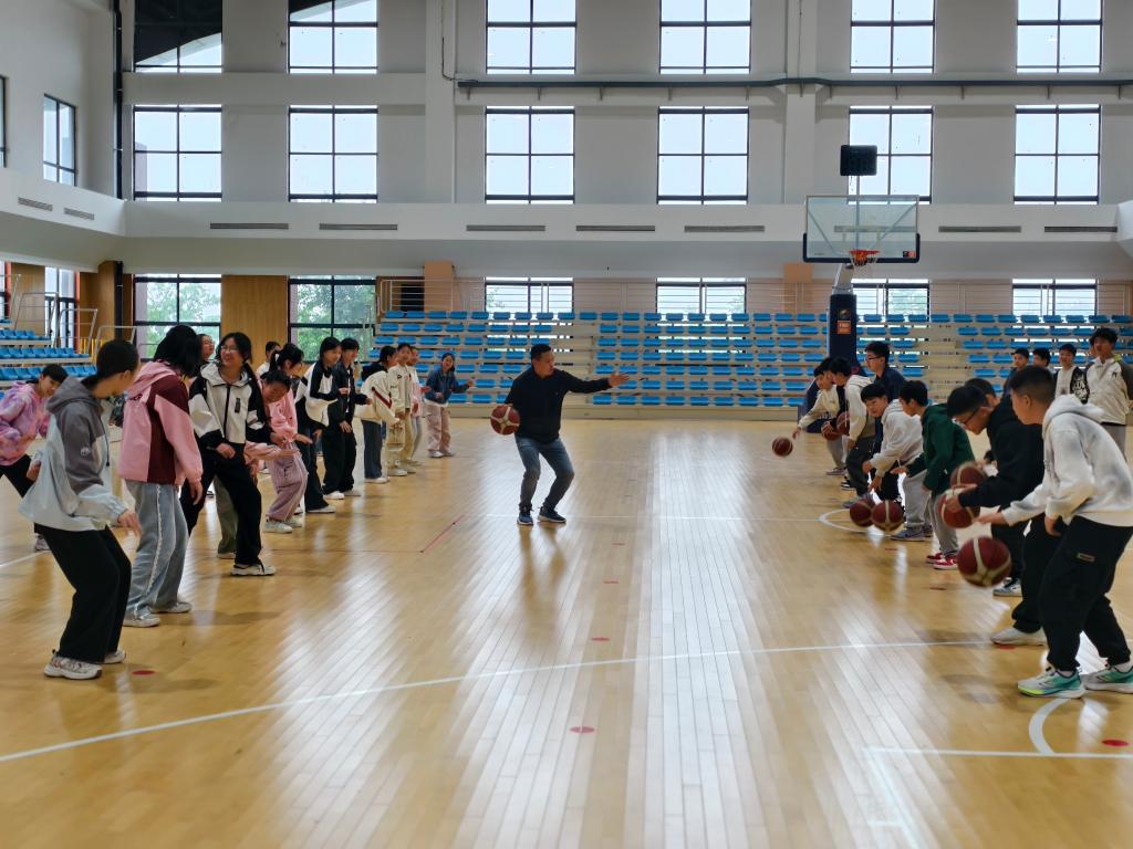 图为蚌埠新城实验学校,语文老师正在教篮球课。