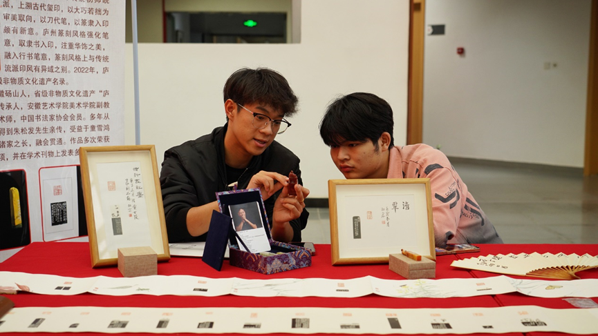 5月8日,安徽艺术学院的学生在了解非遗技艺——庐州篆刻。