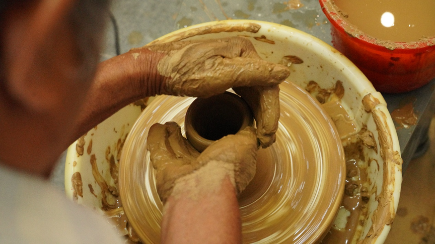 5月8日,非遗传承人在展示界首彩陶技艺。