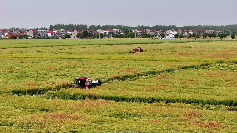 初夏时节,安徽省望江县华阳镇的田野褪去金色花浪,智能收割机穿梭其间,伴着机械轰鸣,一排排沉甸甸的油菜秆整齐收割,籽粒饱满的荚果静待“日光淬炼”,绘就青黄相间的别样丰收画卷。(吴园园 方亚群 朱宏强)