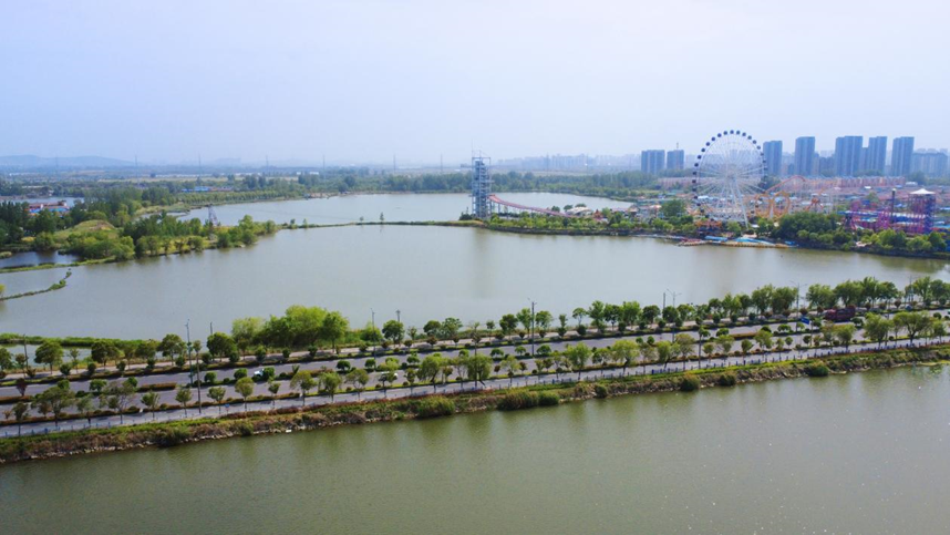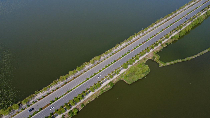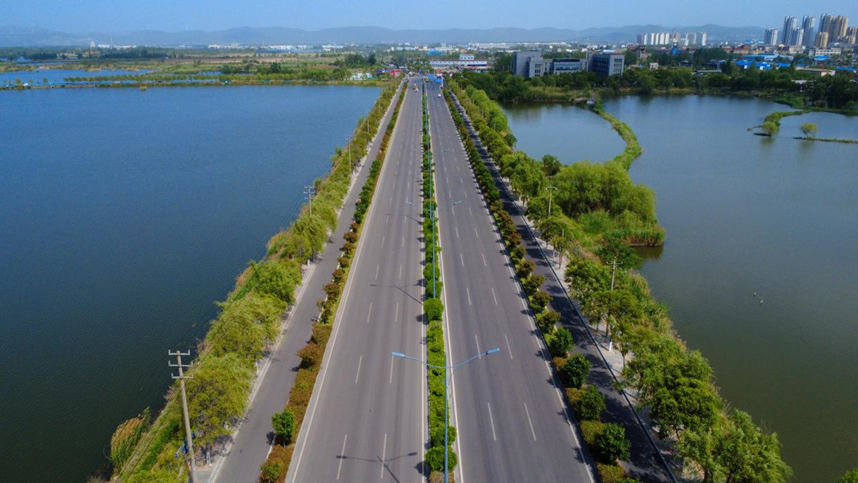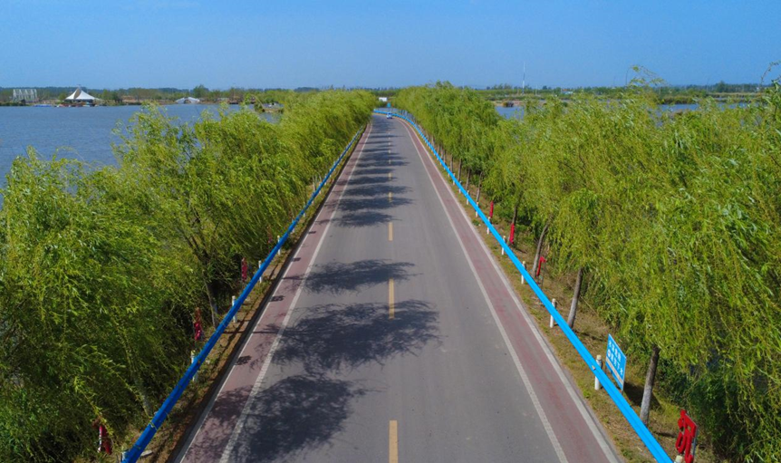 近日,在安徽省淮北市杜集区矿山集街道百莲百荷风景区公路两侧,清风拂过,垂柳摇曳生姿,与过往的车辆相互映衬。