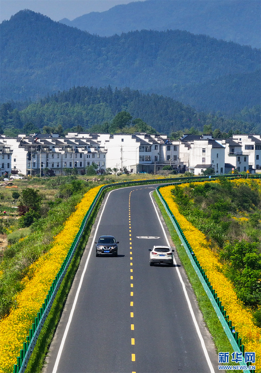 初夏时节,安徽省黄山市休宁县溪口镇石田村景美如画,“四好农村路”015县道旁的金鸡菊花在阳光的照耀下,璀璨夺目,扮靓夏日乡村。