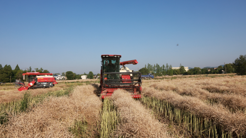 在繁昌区平铺镇新平社区新屋组,广袤的油菜田里数台收割机来回穿梭、有序作业。轰鸣声中,一片片油菜尽收“机囊”,只留下一排排整齐的菜杆。脱壳后的菜籽圆润饱满,油菜秆则被切割成碎末,从尾部喷出,均匀地撒回田里,成为生态肥料。