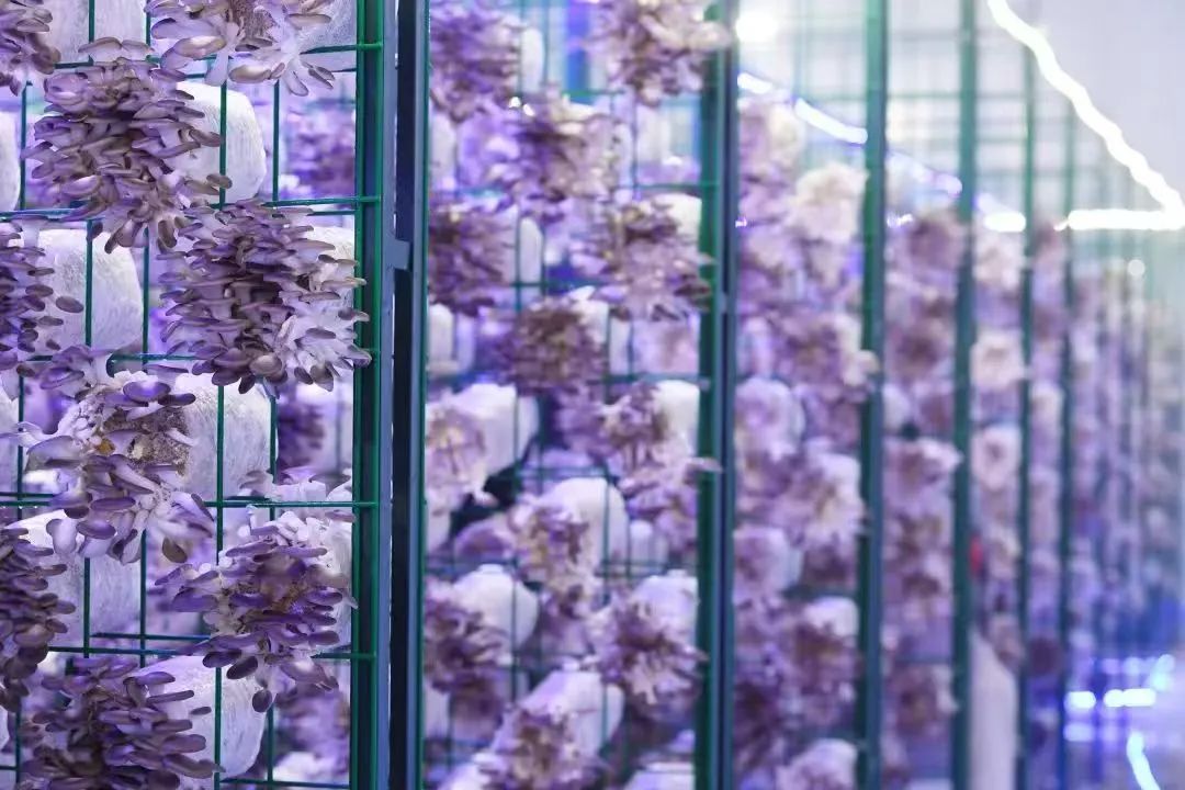 蜀山区菌旅小镇内,一个个智慧“菌菇格子”整齐摆放,菌菇产量喜人。