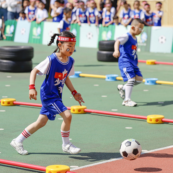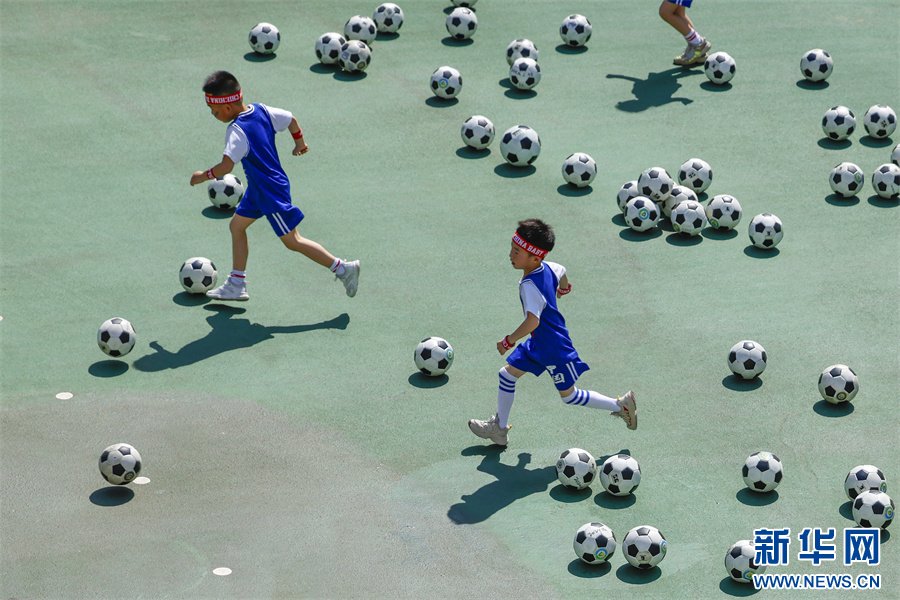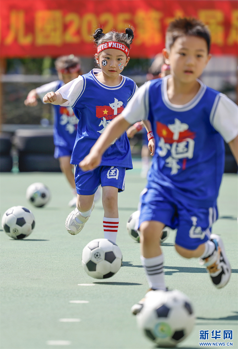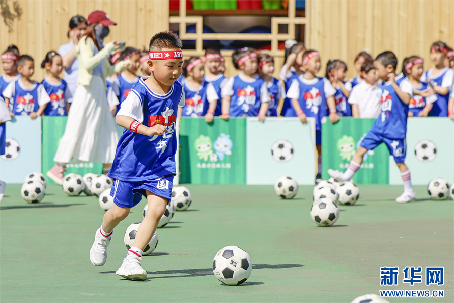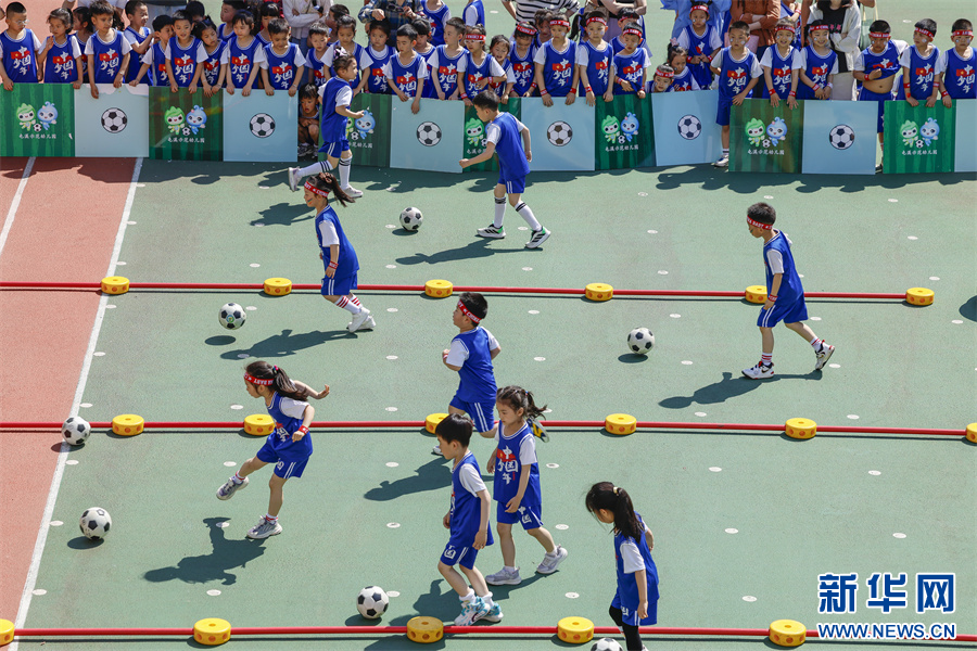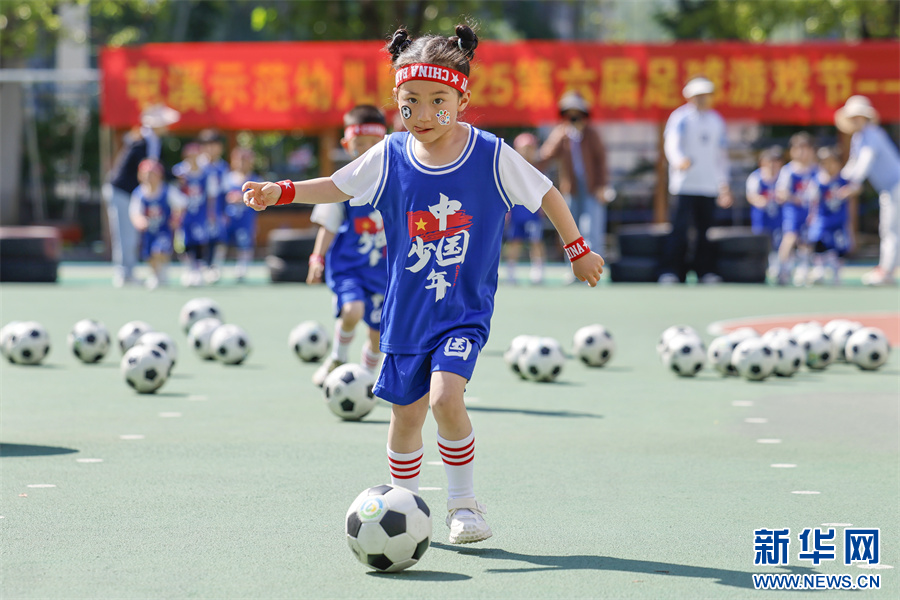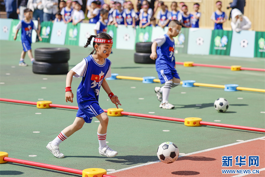当日,为迎接“六一”国际儿童节,作为安徽省黄山市屯溪示范幼儿园系列活动之一的萌娃足球游戏节举行,孩子们在操场上带球奔跑、射门,在游戏和运动中享受足球乐趣,跃动的身影描绘出童年最鲜活的色彩。新华网发(施亚磊 摄)