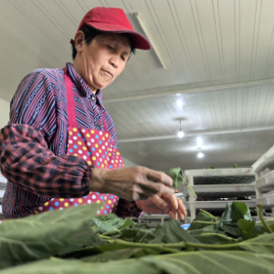 5月16日,养蚕工人为蚕宝宝准备新鲜桑叶。新华网汤阳 摄