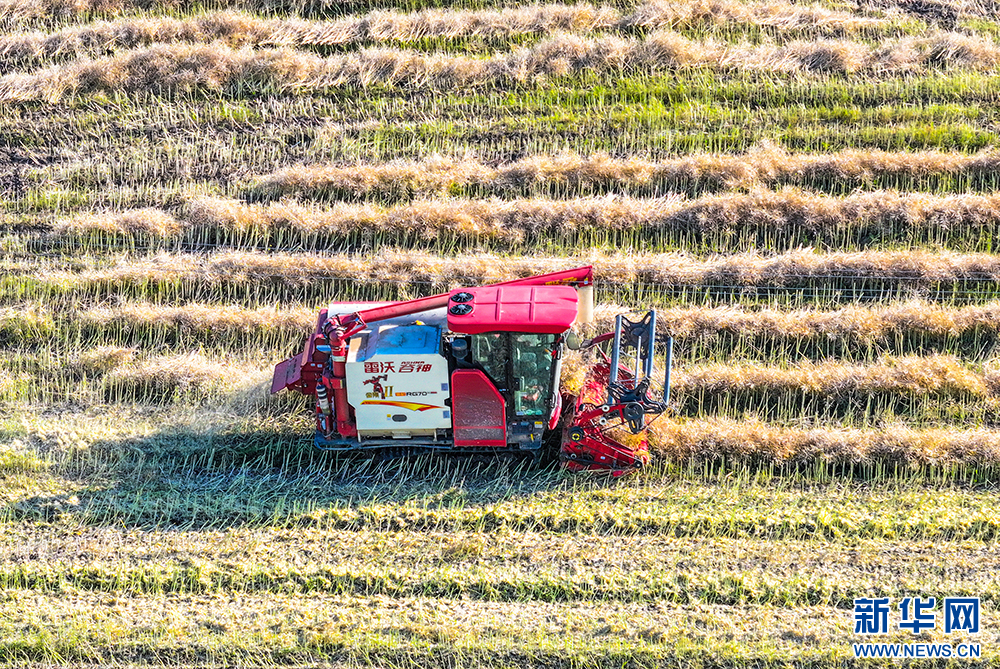 农机手驾驶收割机抢收油菜