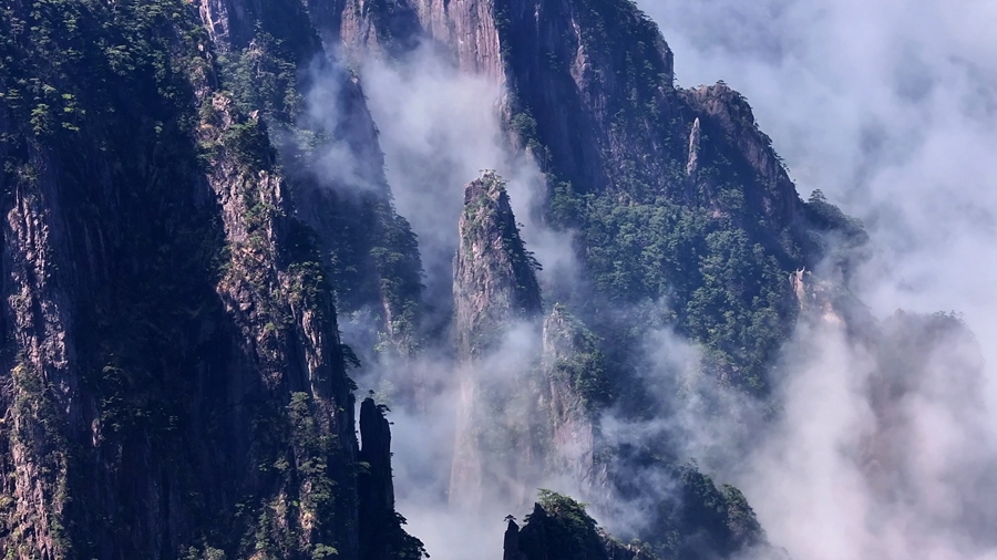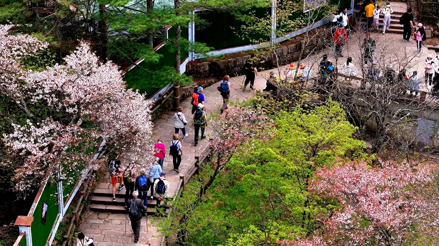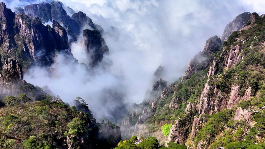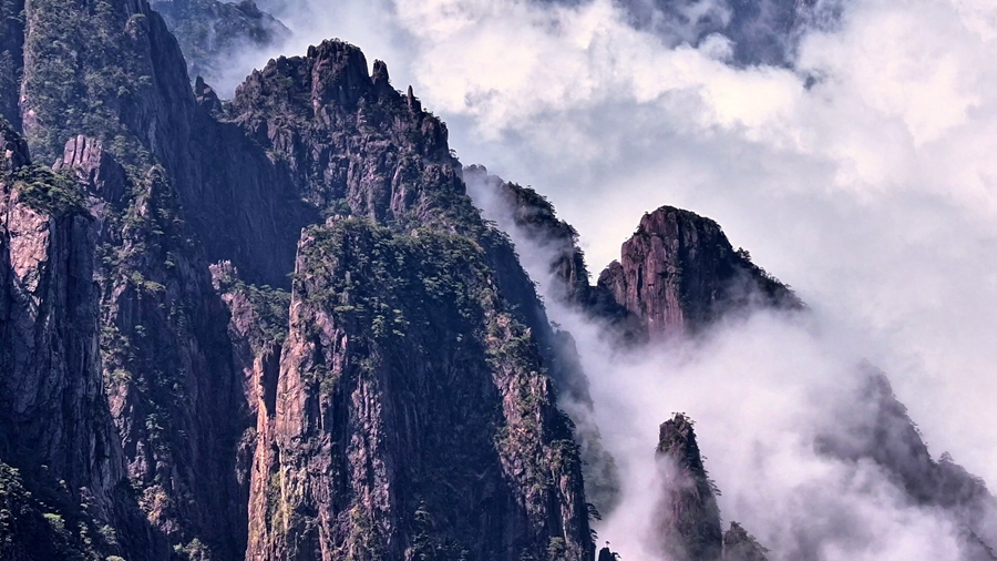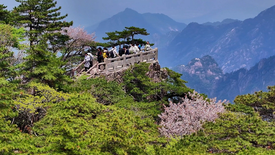 初夏时节,黄山之巅粉白的樱花缀满枝头,如雪似霞般点缀着苍翠的群峰。云海翻涌处,奇松怪石若隐若现,与漫山樱色交织成流动的诗意画卷。