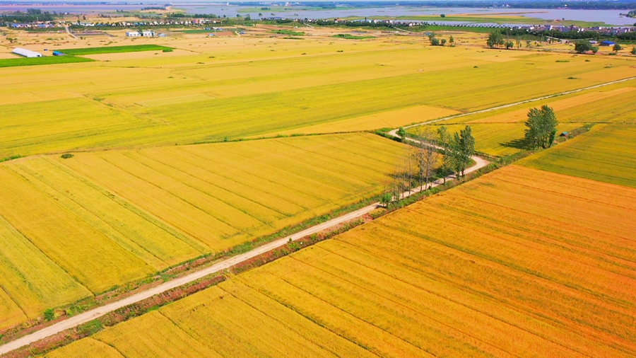 初夏时节,安徽省颍上县广袤大地上麦香四溢。麦田在阳光下泛着金黄,麦浪滚滚,收获在望。麦田、村落、河流、阡陌构成一幅美丽的田园风光。(徐红梅)