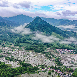 5月17日,在安徽省宣城市旌德县白地镇汪村,村民抢抓农时对高山梯田进行蓄水插秧。层层叠叠的梯田、错落有致的民居在云海掩映下若隐若现,美不胜收。新华网发(江建兴 梅妍 摄)