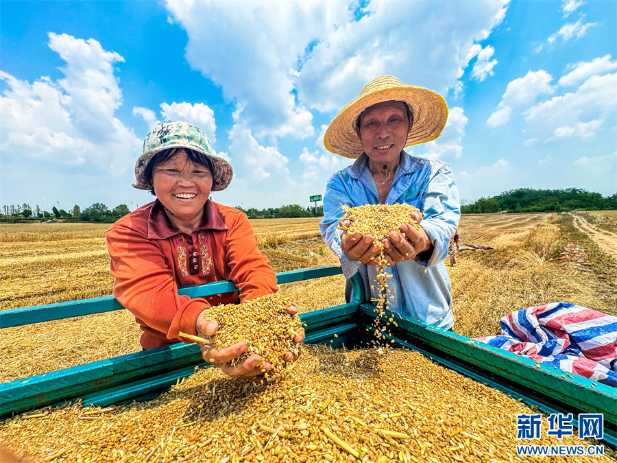 5月21日,在安徽省阜阳市颍州区西湖镇白行社区麦田,农民展示收割后的小麦。