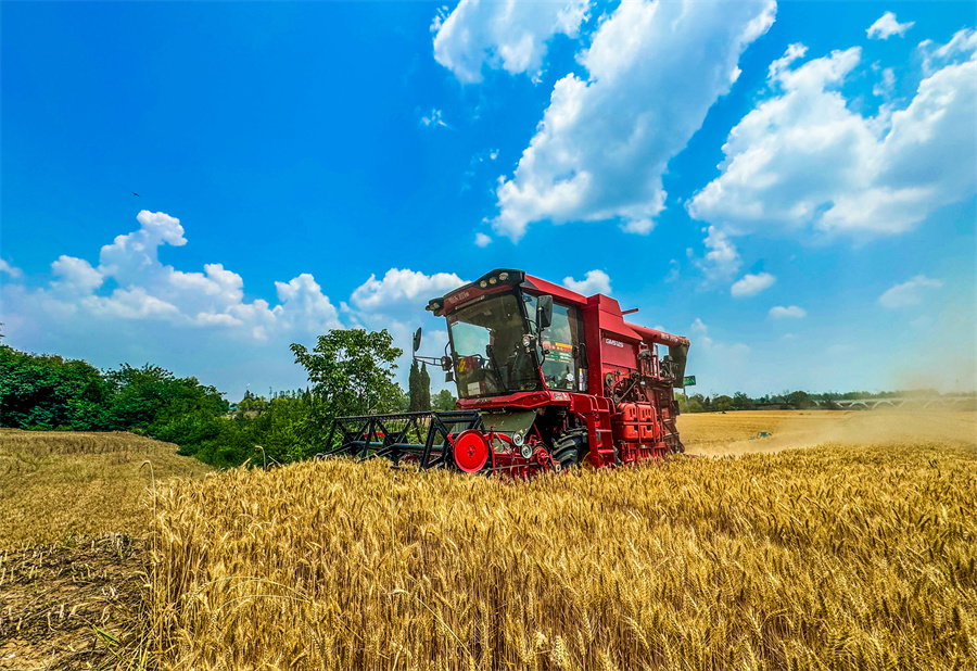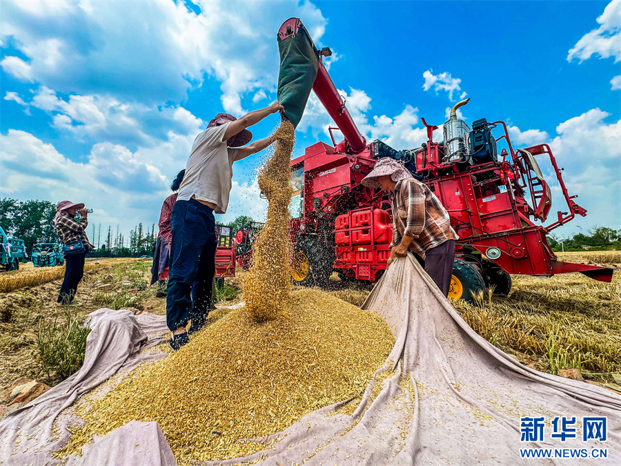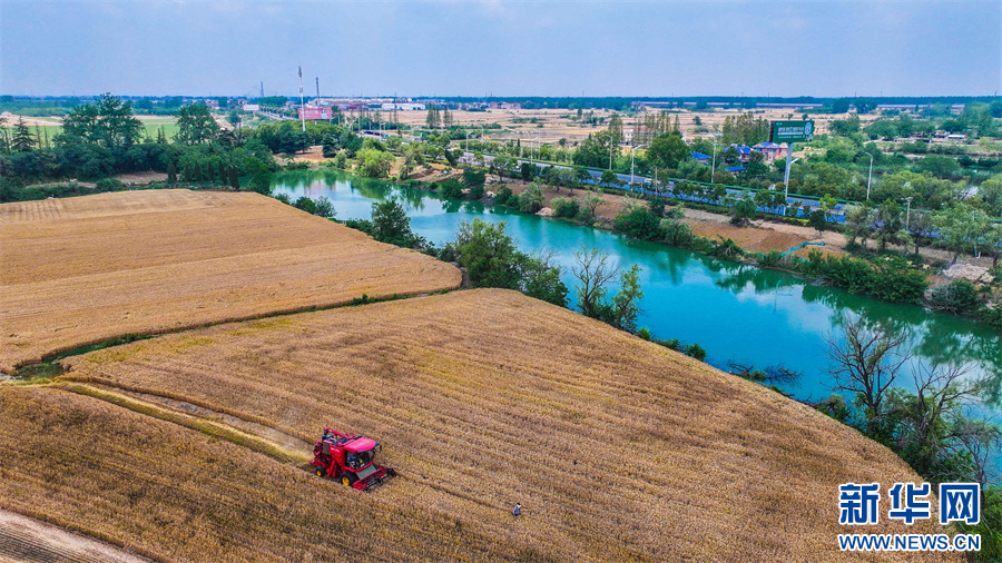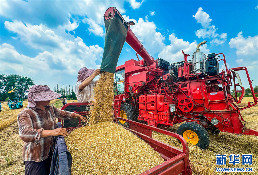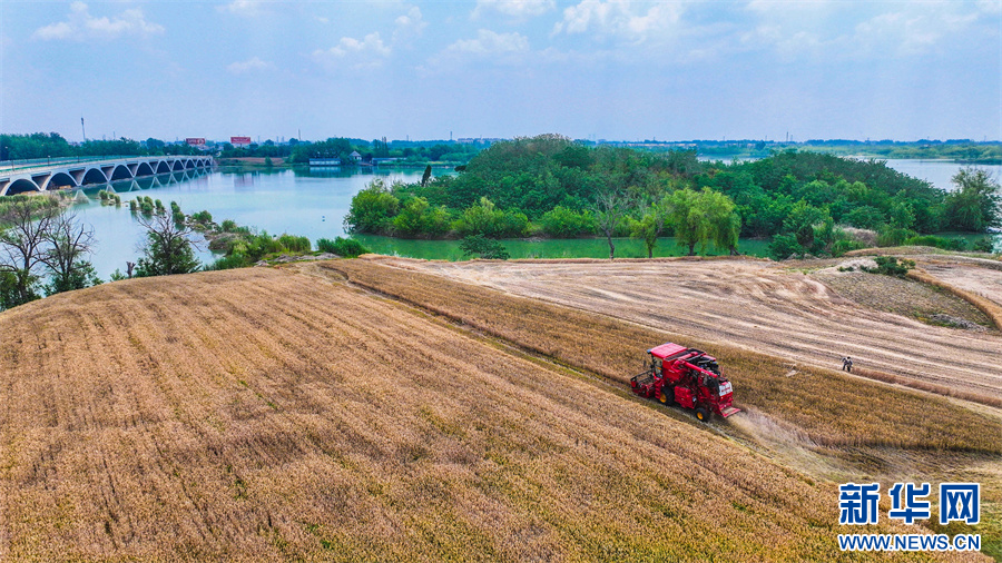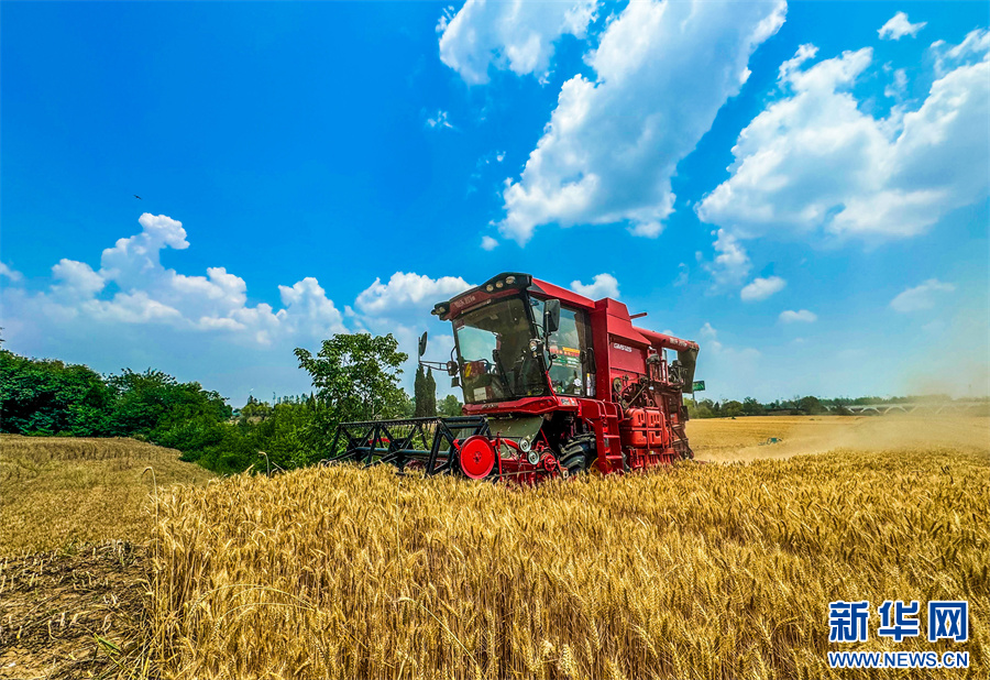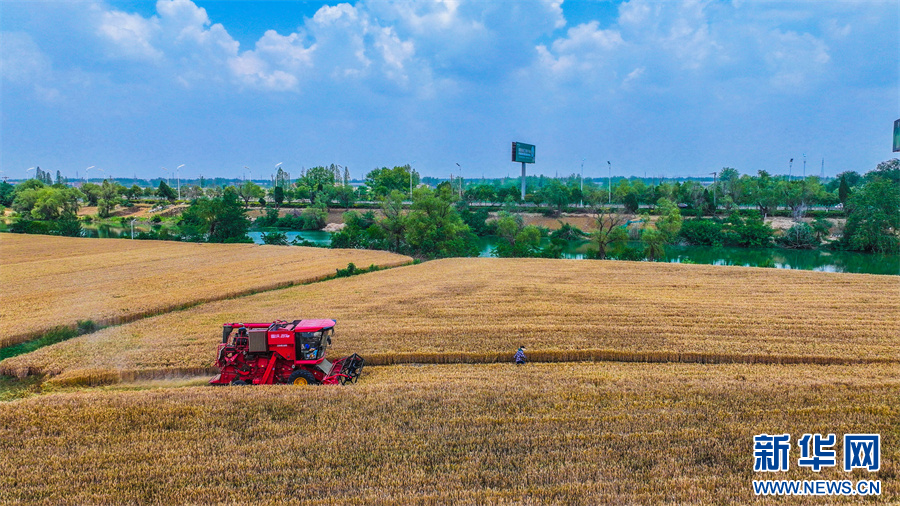当日,小满时节,阜阳市各地小麦进入收获期,农民们抢抓农时,驾驶收割机抢收小麦,确保夏粮应收尽收。新华网发(庞诚 摄)
