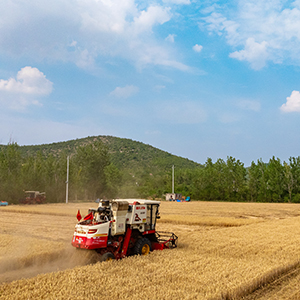 农机手驾驶收割机收割小麦。