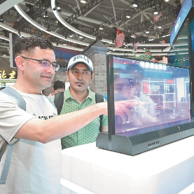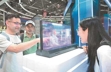 5月22日,外国友人在深圳文博会安徽文化产业综合馆,通过科大讯飞多语种AI透明屏进行无障碍交流。本报记者 张大岗 摄