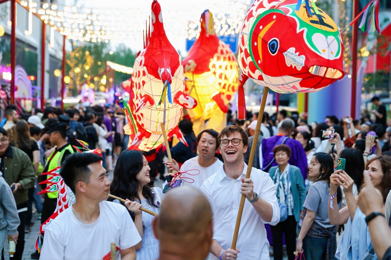 “太棒了!感觉体验到了真正的中国!”在上海纽约大学的毕业季活动上,瞻淇鱼灯闪烁着最耀眼的中国红,一群年轻人围着流光溢彩的鱼灯发出惊叹。不少外国学生也举起手中的小鱼灯加入到巡游狂欢中,“这个会发光的东方锦鲤,应该成为全球毕业生的幸运符!”