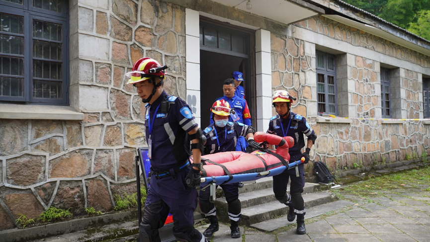 5月27日,“建筑物坍塌搜救与人员应急包扎救护”项目比赛现场。(丁灿 摄)
