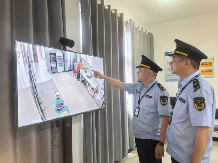 “后厨人员请注意,这里是颍州区市场监管局西湖所,监控发现您未规范佩戴口罩,请立即整改。”近日,在阜阳市颍州区西湖镇水岸老年公寓食堂后厨,一名后厨人员经视频监控“远程喊话”提醒,立即佩戴好口罩,并向摄像头挥手致意。