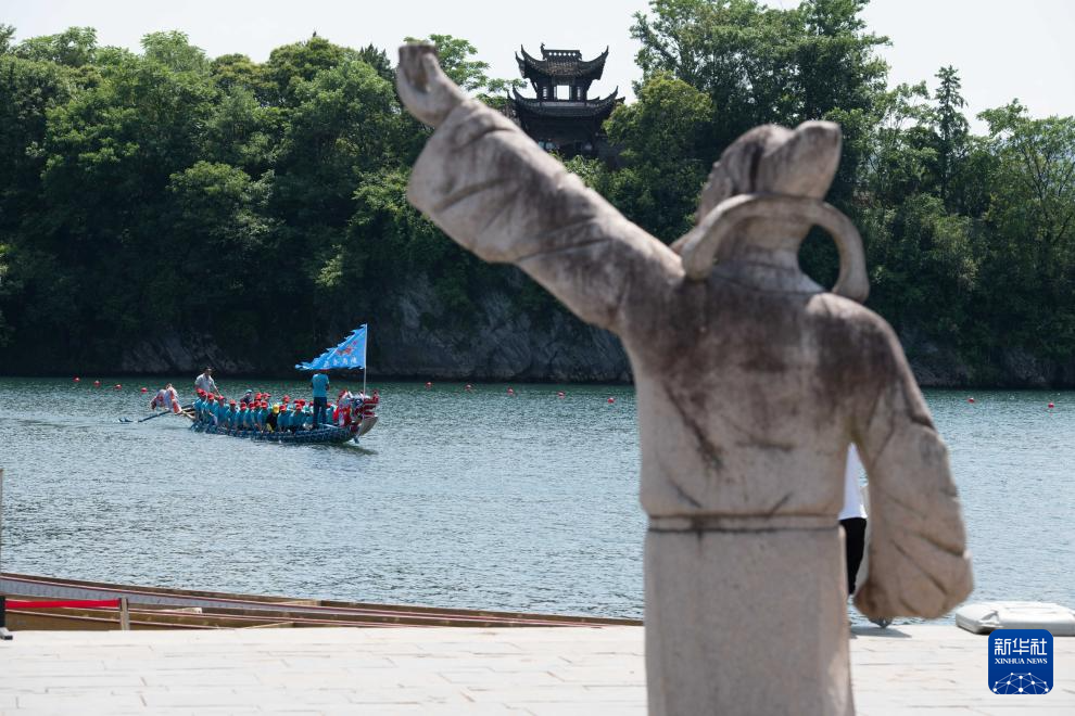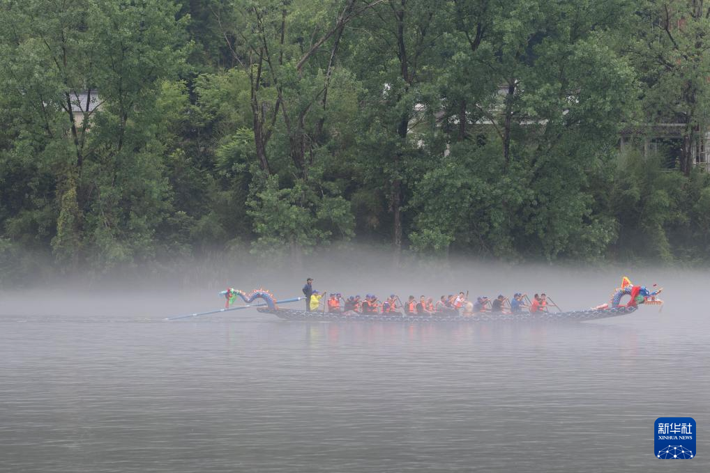 5月28日,在安徽省宣城市泾县桃花潭镇,当地的一支龙舟队在桃花潭风景区划龙舟。