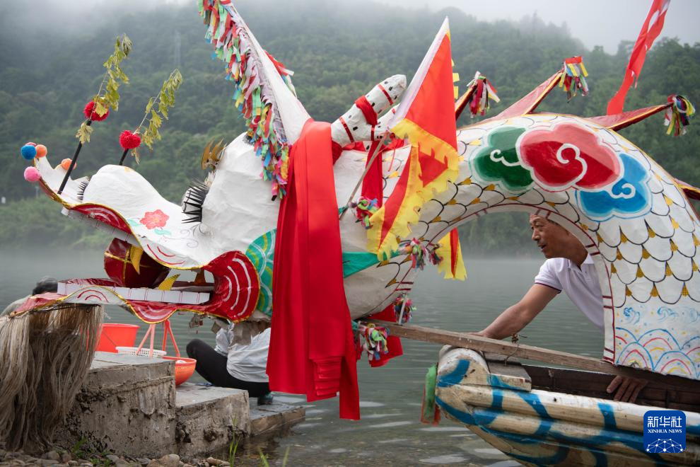 5月29日,在安徽省宣城市泾县桃花潭镇,村民翟光辉(右)在进行划龙舟前的准备工作。