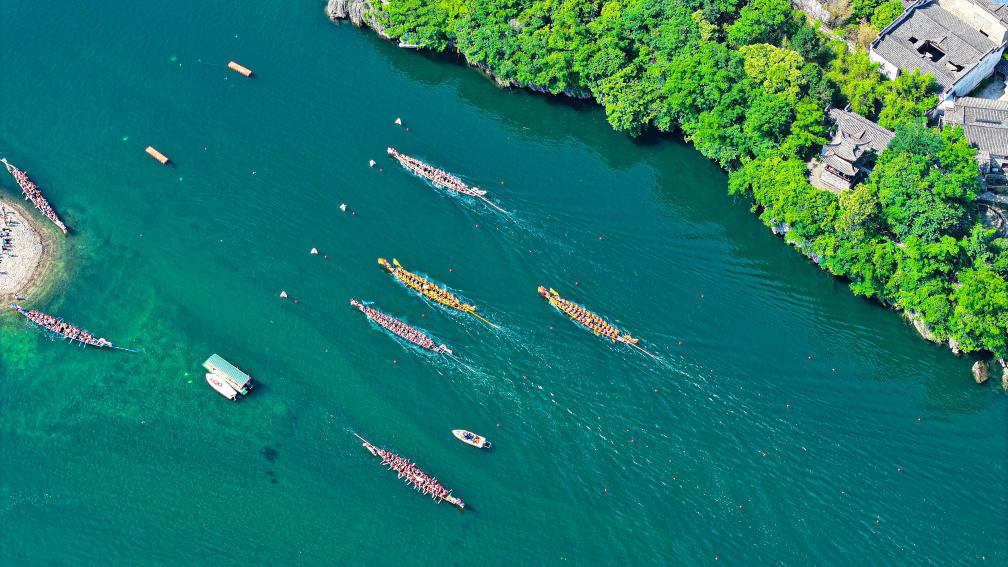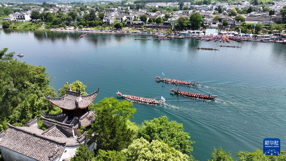 5月30日,在安徽省宣城市泾县桃花潭镇,数支龙舟队在参与当地举办的龙舟赛,迎接端午节的到来(无人机照片)。