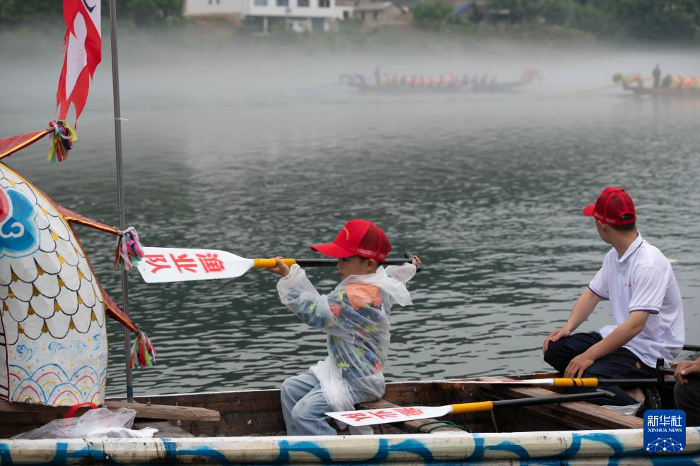 5月28日,在安徽省宣城市泾县桃花潭镇,今年6岁的翟少宇(前左)在体验划龙舟。