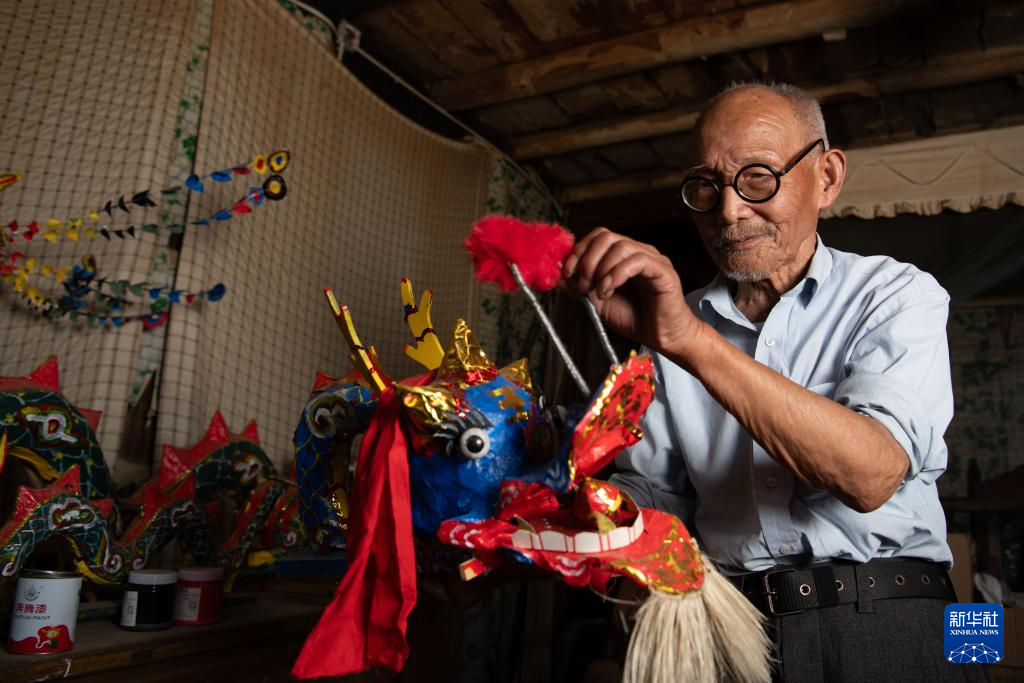 5月28日,在安徽省宣城市泾县桃花潭镇,85岁的村民翟大满在介绍他手工制作的“龙头”,这种“龙头”由竹篾扎成骨架后糊纸上色制成。