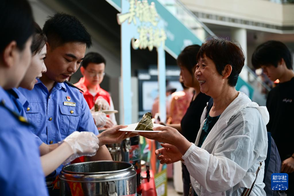 5月30日,工作人员在合肥站候车大厅向旅客赠送粽子。