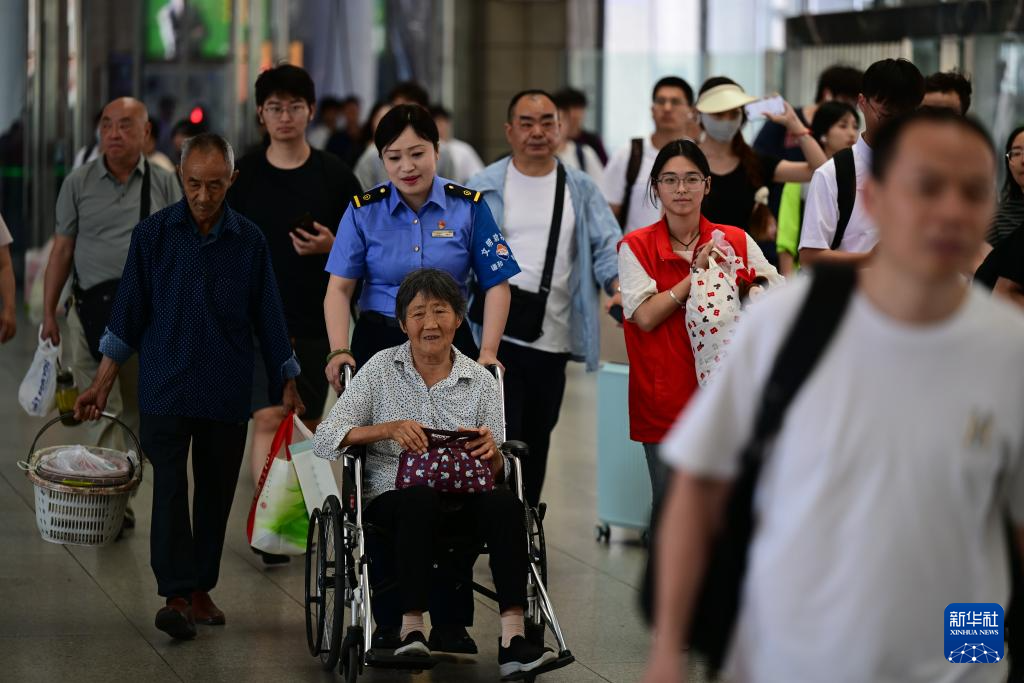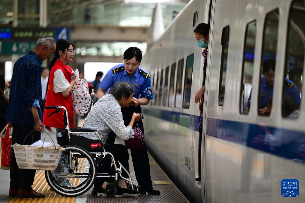 5月30日,合肥站工作人员和志愿者帮助行动不便的旅客前往站台乘车。