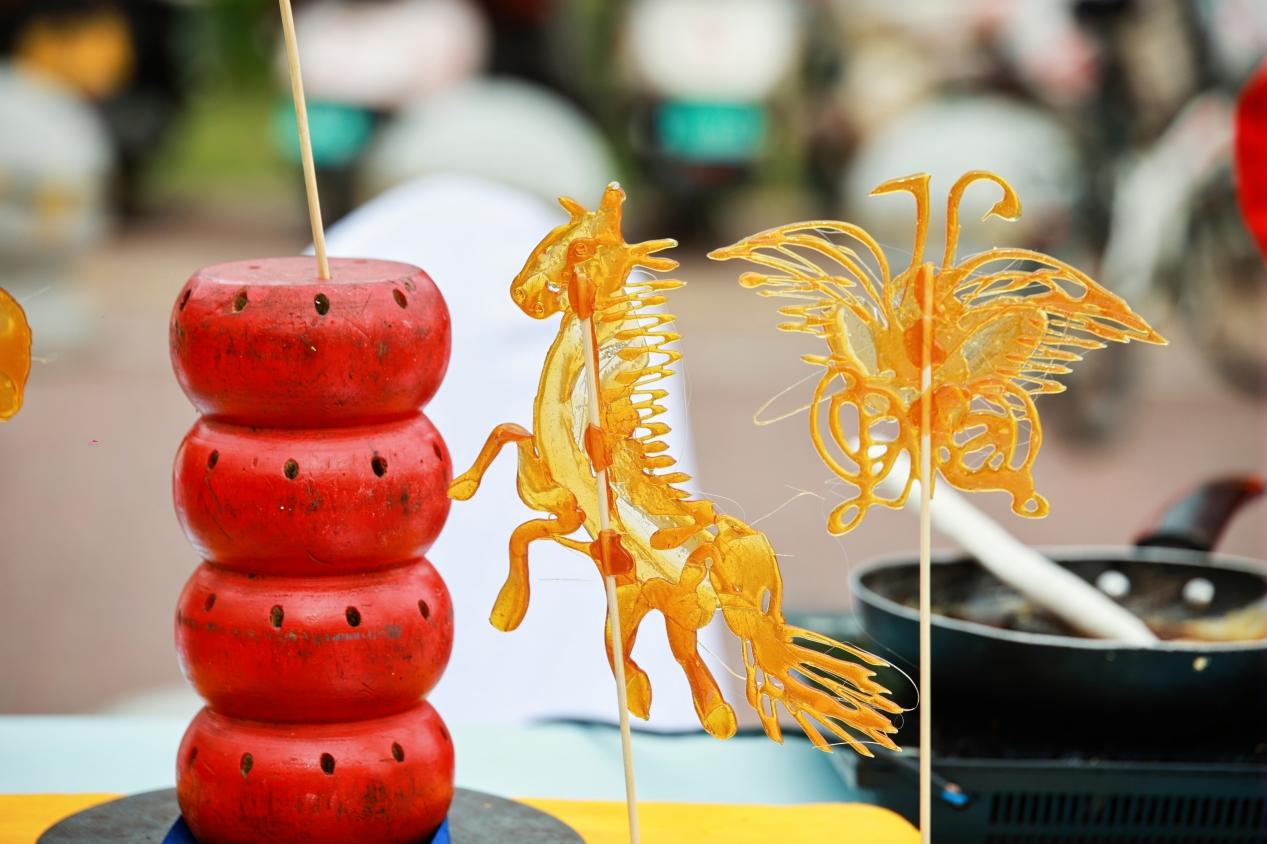 活动现场,来自长三角地区及临泉县、庐阳区的非遗代表性传承人各展所长。临泉传统弓箭射艺区排起长队,游客们搭箭拉弓,感受“百步穿杨”的传统技艺魅力;庐阳糖画摊位前,年轻人手持铜勺,在非遗传承人指导下勾勒专属甜蜜;周氏梅花针灸则用银针串联起中医智慧与现代健康理念。