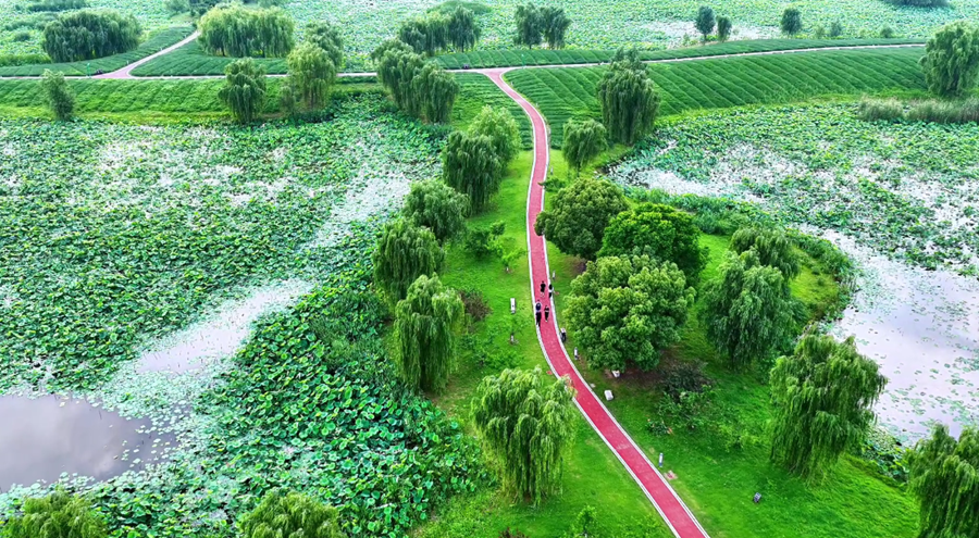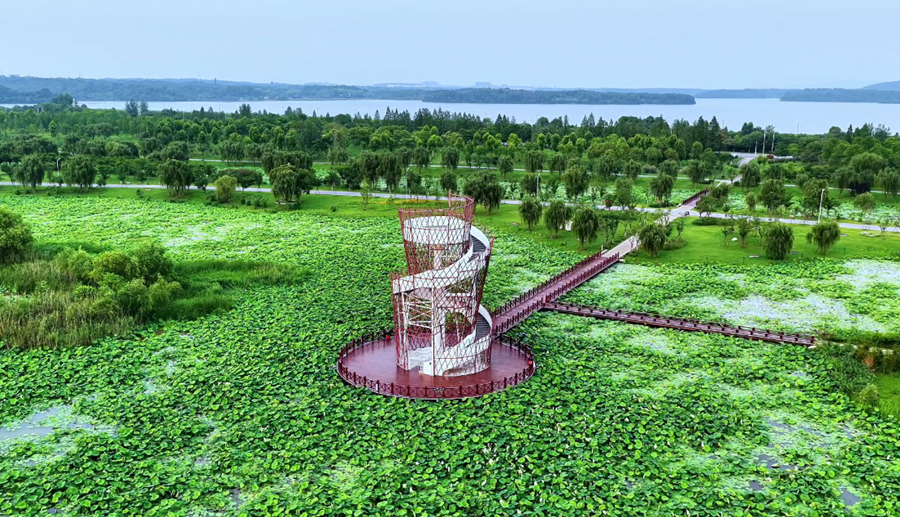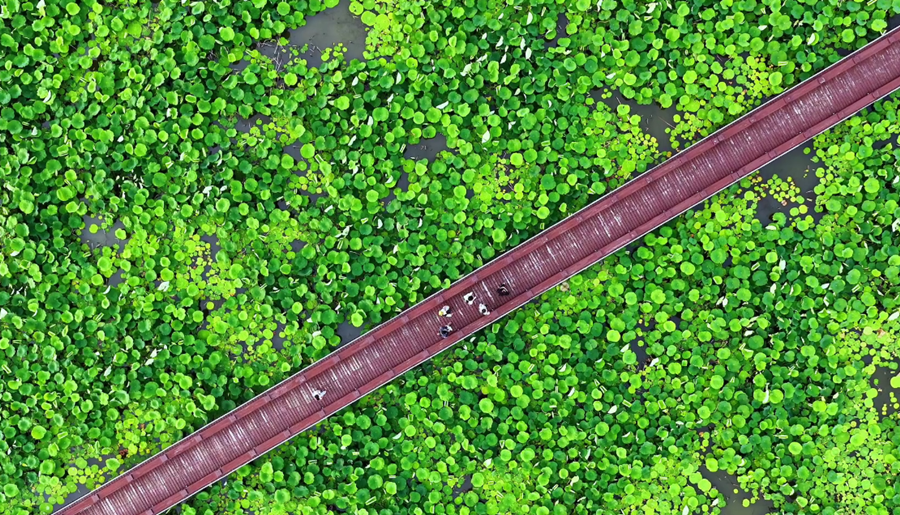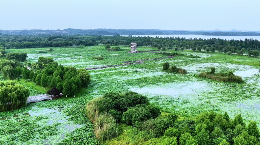 初夏时节,安徽省池州市平天湖国家湿地公园内,草木葱茏,荷叶田田,呈现一幅优美的生态画卷。(何先发)
