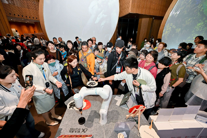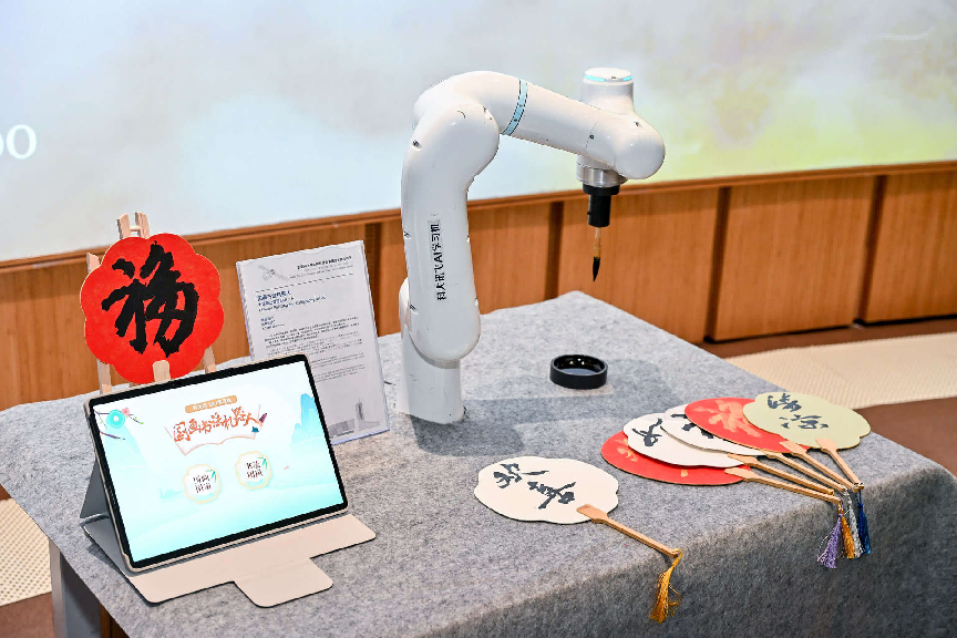仅需数十秒,“福”字便跃然扇面。现场游客可从“福”“雅”“清凉”“欢喜”“自在”“喜乐”“如意”“好运”“顺遂”等多个富有文化意涵的汉字中自由选择书写内容,并加盖“小飞飞”、世博会吉祥物“脉脉”等特色印章,将这份融合科技与文化的创意纪念品带回家。