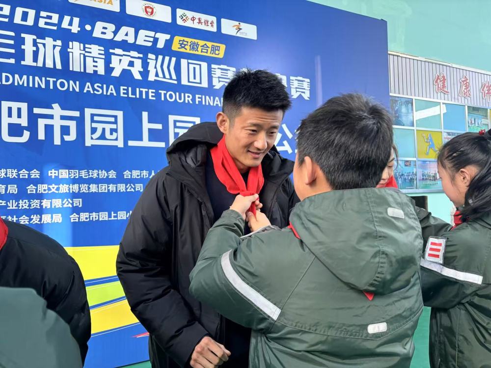 2024年12月15日,羽毛球奥运冠军谌龙走进合肥市园上园小学,与学生进行互动。新华社记者 周畅 摄