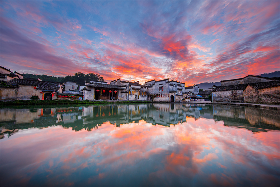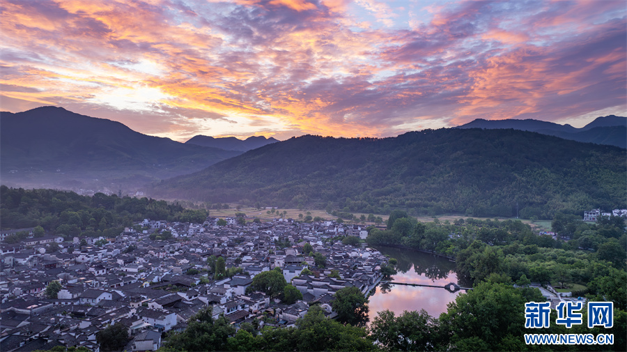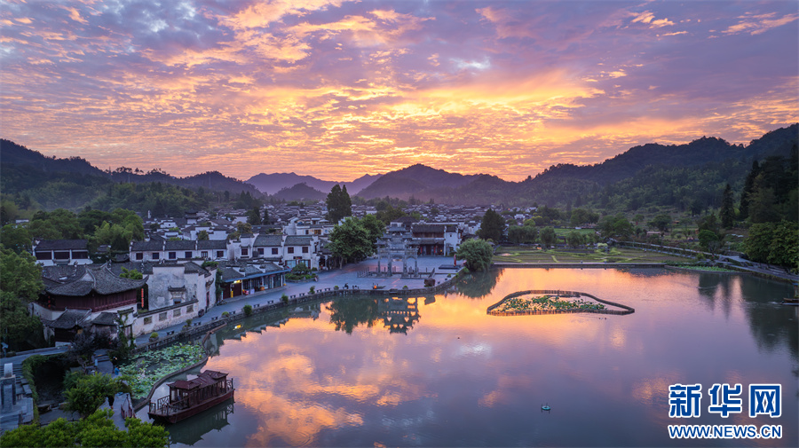 夏日时节,位于安徽省黄山市黟县西递和宏村古村的传统徽派建筑沐浴在朝霞之中,美如画卷。(汪澄 摄)