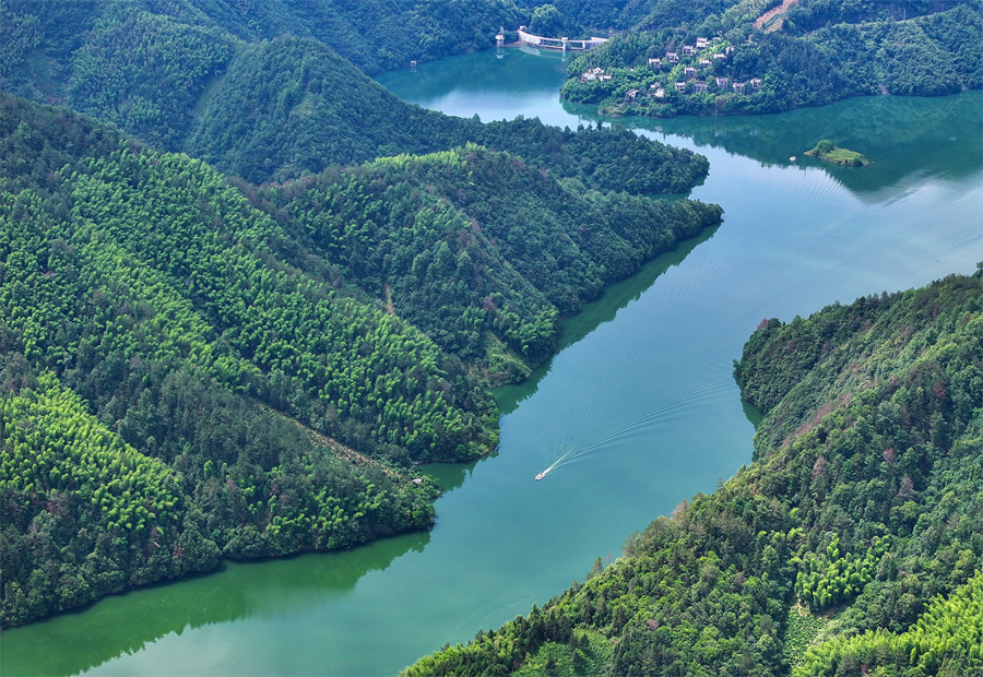 仲夏时节,在安徽省黄山市徽州区洽舍乡,丰乐河碧波轻漾、沿岸青山叠翠,环绕着鳞次栉比的徽派村落,绘就了一幅生机盎然的山水田园图卷。