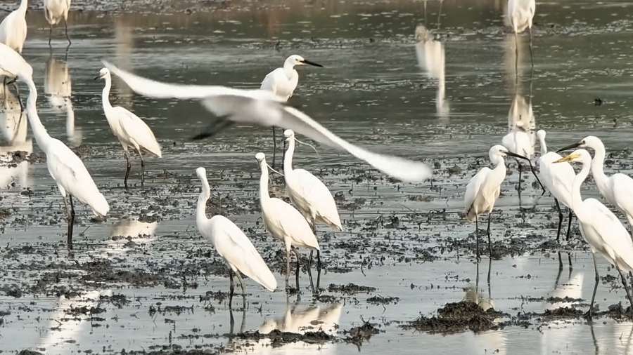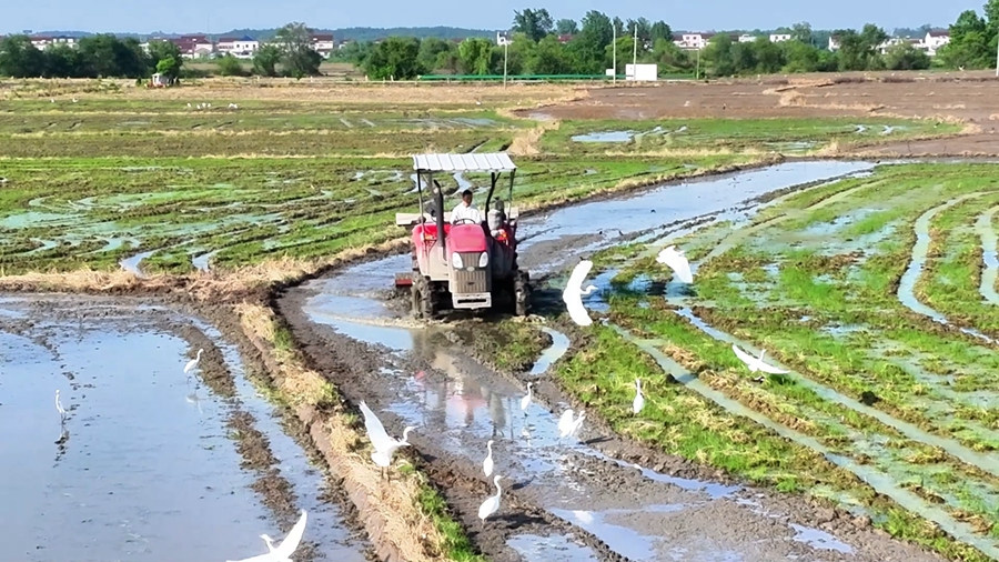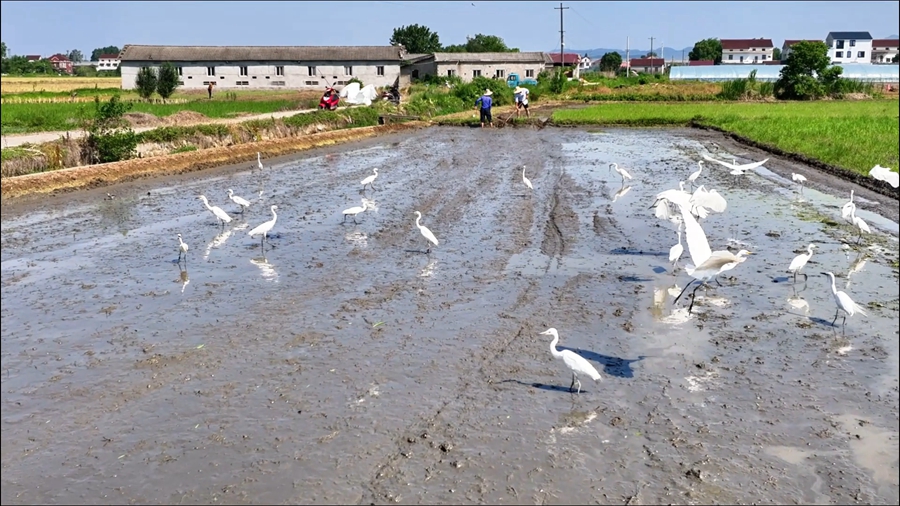 正值农忙时节,安徽省太湖县的田野间呈现出一幅生机盎然的景象。成群的白鹭时而展翅低飞,时而俯身掠过水面,翩翩身影与耕作的农机共舞,构成了动人的生态画卷。