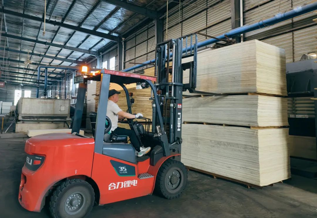 走进基材生产车间,只见叉车运送着板材来回穿梭,一块板材经过贴面、修补、分片、定厚砂光、开槽、油漆等程序,就变成了各种样式的木地板。