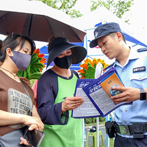 6月9日,合肥市公安局瑶海分局民警在辖区内考点开展反诈宣传。新华社发(吕敏 摄)