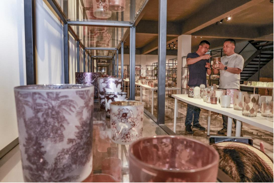 6月6日,客商在安徽高键工艺品有限公司产品展示室参观考察玻璃工艺品。