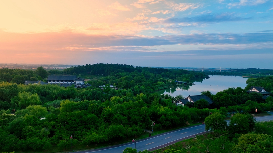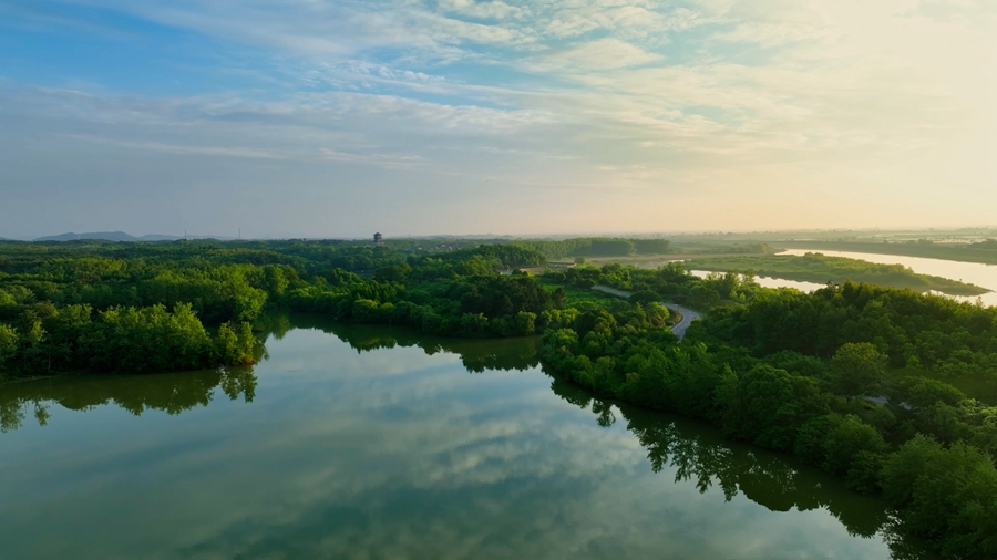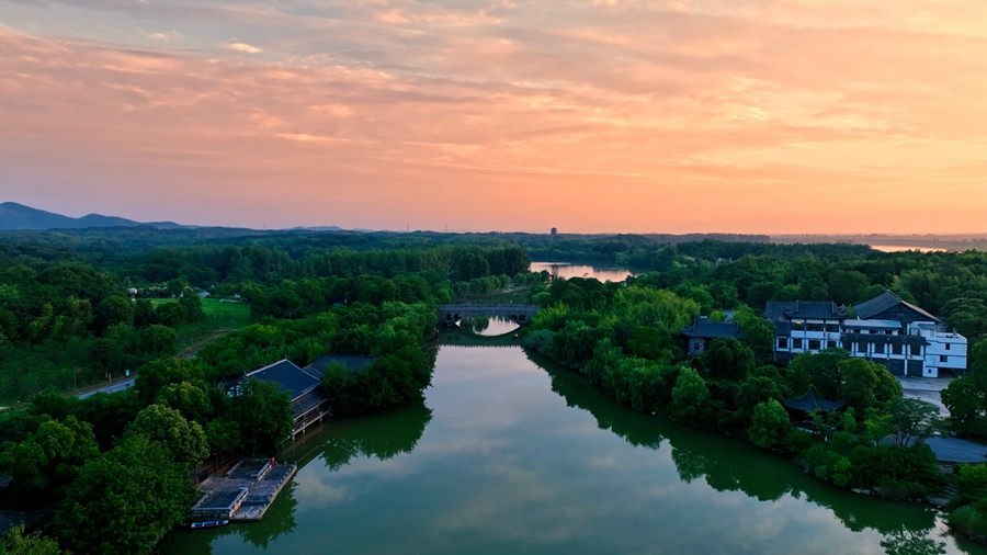 夏日时节,安徽省池州市杏花村景区水面如镜,倒映着村落的古朴、流云的飘逸,轻舟穿行霞光倒影间,仿佛划入水墨丹青。