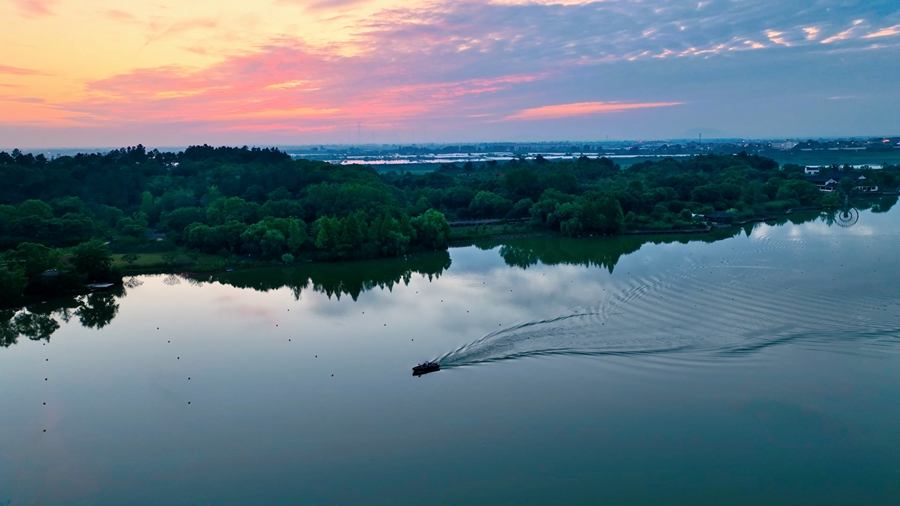 夏日时节,安徽省池州市杏花村景区水面如镜,倒映着村落的古朴、流云的飘逸,轻舟穿行霞光倒影间,仿佛划入水墨丹青。(程爽)