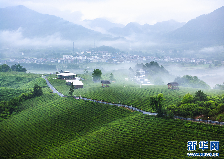夏日雨后,在安徽省宣城市旌德县三溪镇路西村,生态茶园与云雾、青山等相映成景,美不胜收。