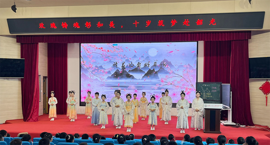 “少年智则国智,少年富则国富,少年强则国强……”活动最后,全体四年级学生齐背《少年中国说》。孩子们精神抖擞、声音洪亮,饱含深情地朗诵着这篇经典文章。一句句铿锵有力的话语,展现出他们作为新时代少年的责任与担当,也传递出对祖国的热爱和对未来的憧憬。