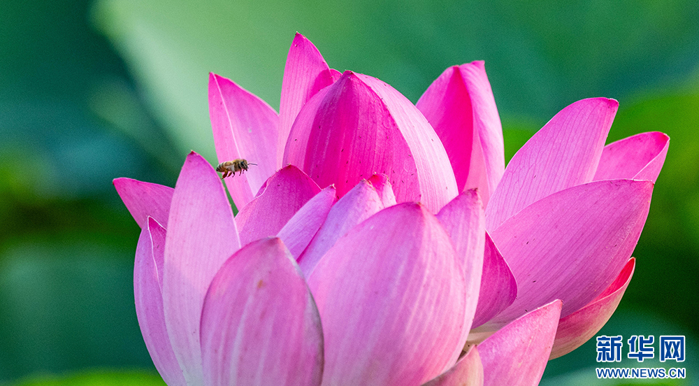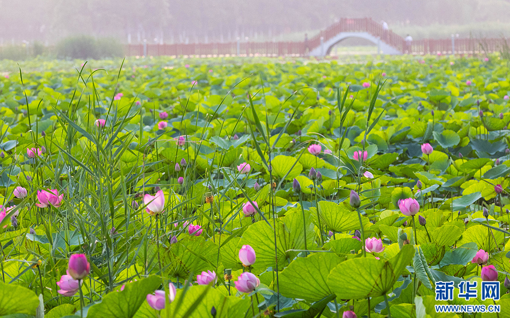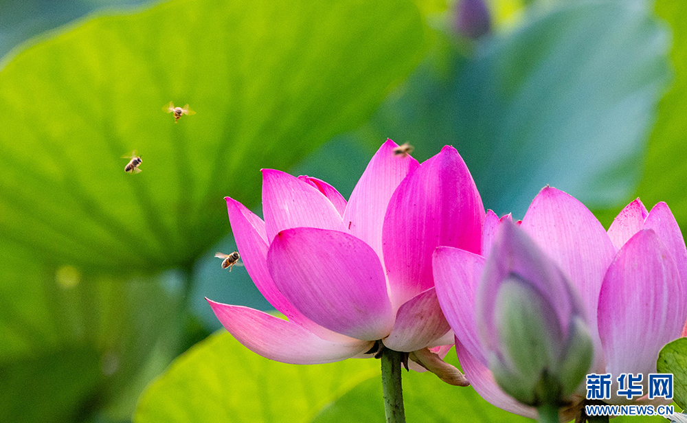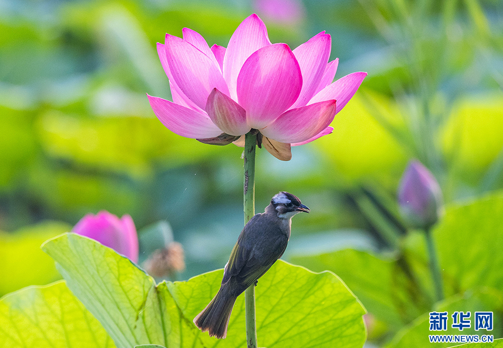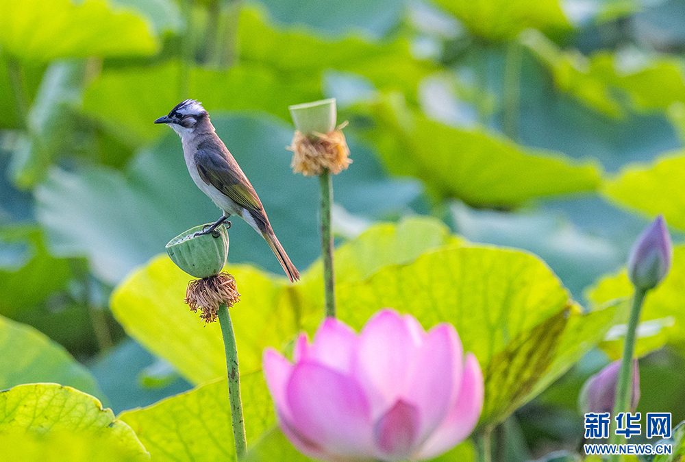 仲夏时节,安徽省淮北市桓谭公园的荷花竞相绽放,散发淡淡幽香。鸟儿、蜜蜂穿梭其间,成为夏日里一道生态美景。新华网发(王文 摄)