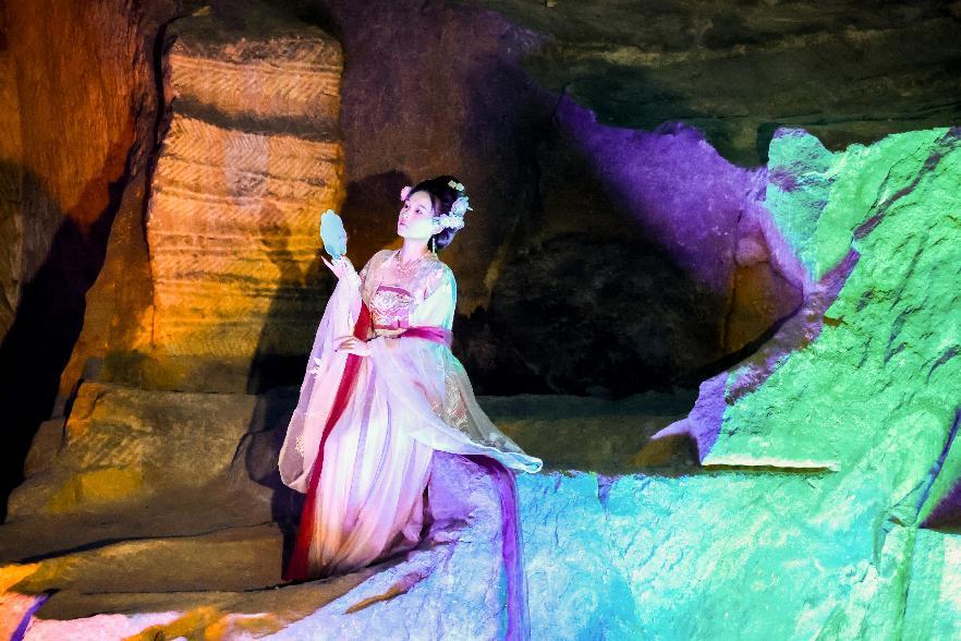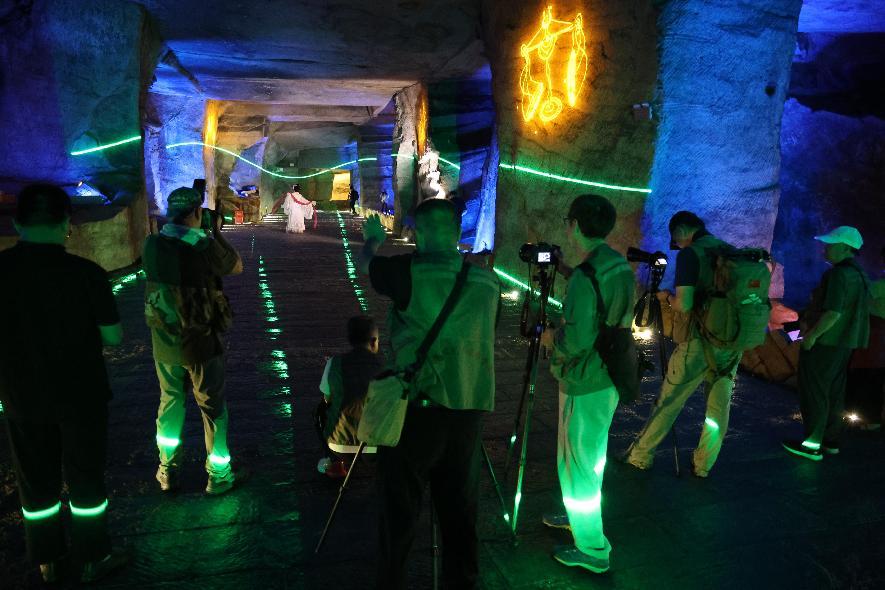 摄影家们深入园区开展创作采风,在幻光石窟、探谜现场等标志性景点,运用各类拍摄手法,记录光影交织的奇幻景象,捕捉灯光艺术与自然山水间的奇妙碰撞。摄影师们纷纷感叹:“花山谜窟的时空交错感为创作提供了无限可能,每一帧都是大自然的馈赠。”