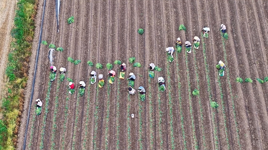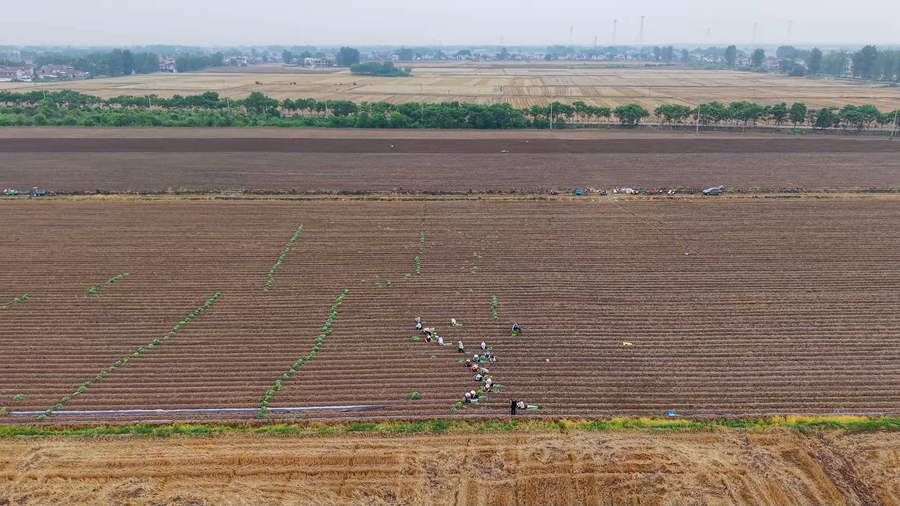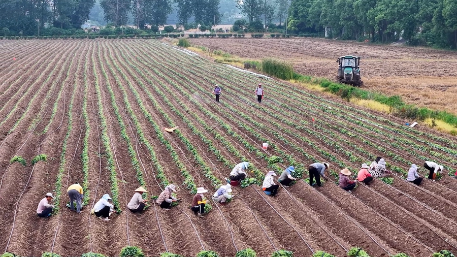 夏日时节,在安徽省望江县雷池镇的蜜薯种植示范基地里,工人们忙着在黄土地上铺展绿色“诗行”,为特色种植产业谱写丰收的序章。