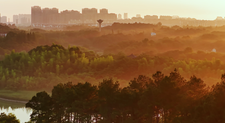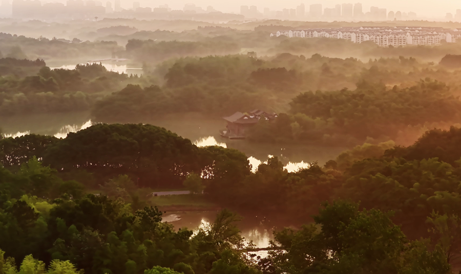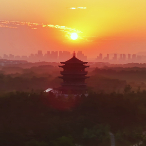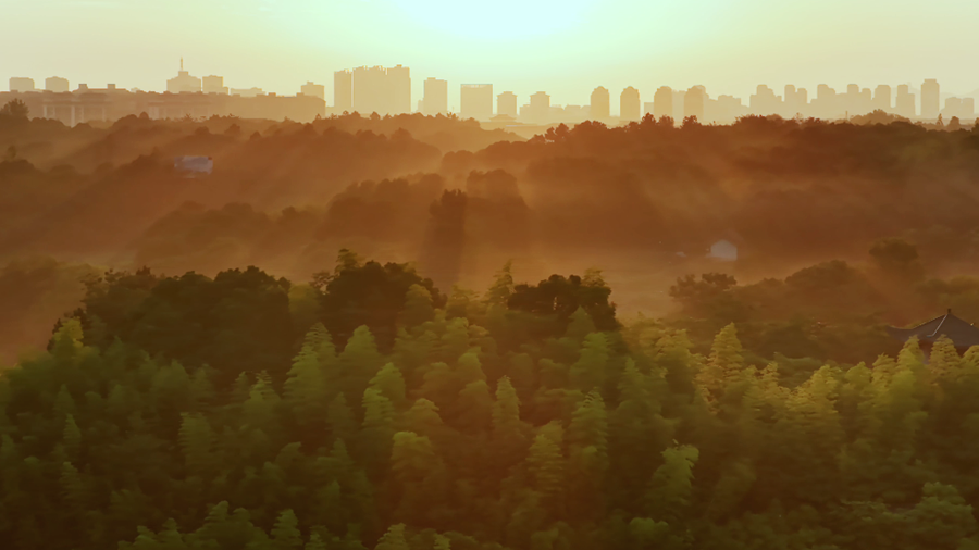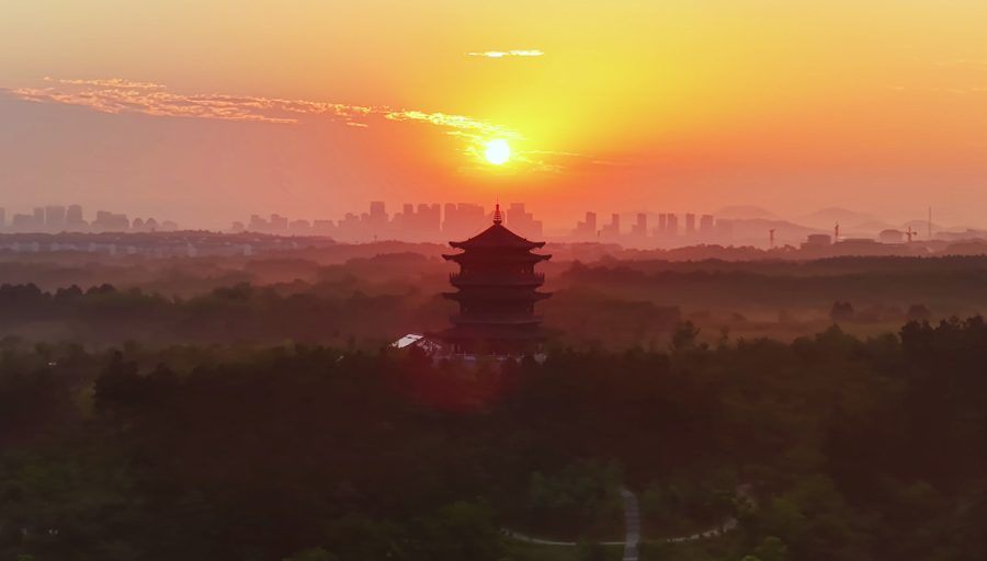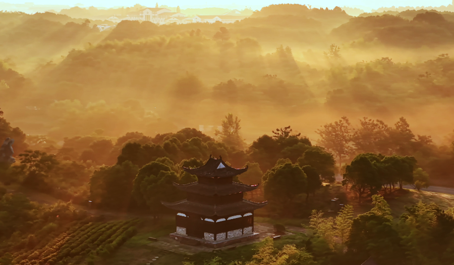 近日,安徽省池州市杏花村文化旅游区上演了一场自然光影秀。朝阳初升时,云隙间迸射的阳光在雾气中形成壮观的“丁达尔效应”,仿佛披上一层梦幻的金纱,美不胜收。(饶治国 胡彬)